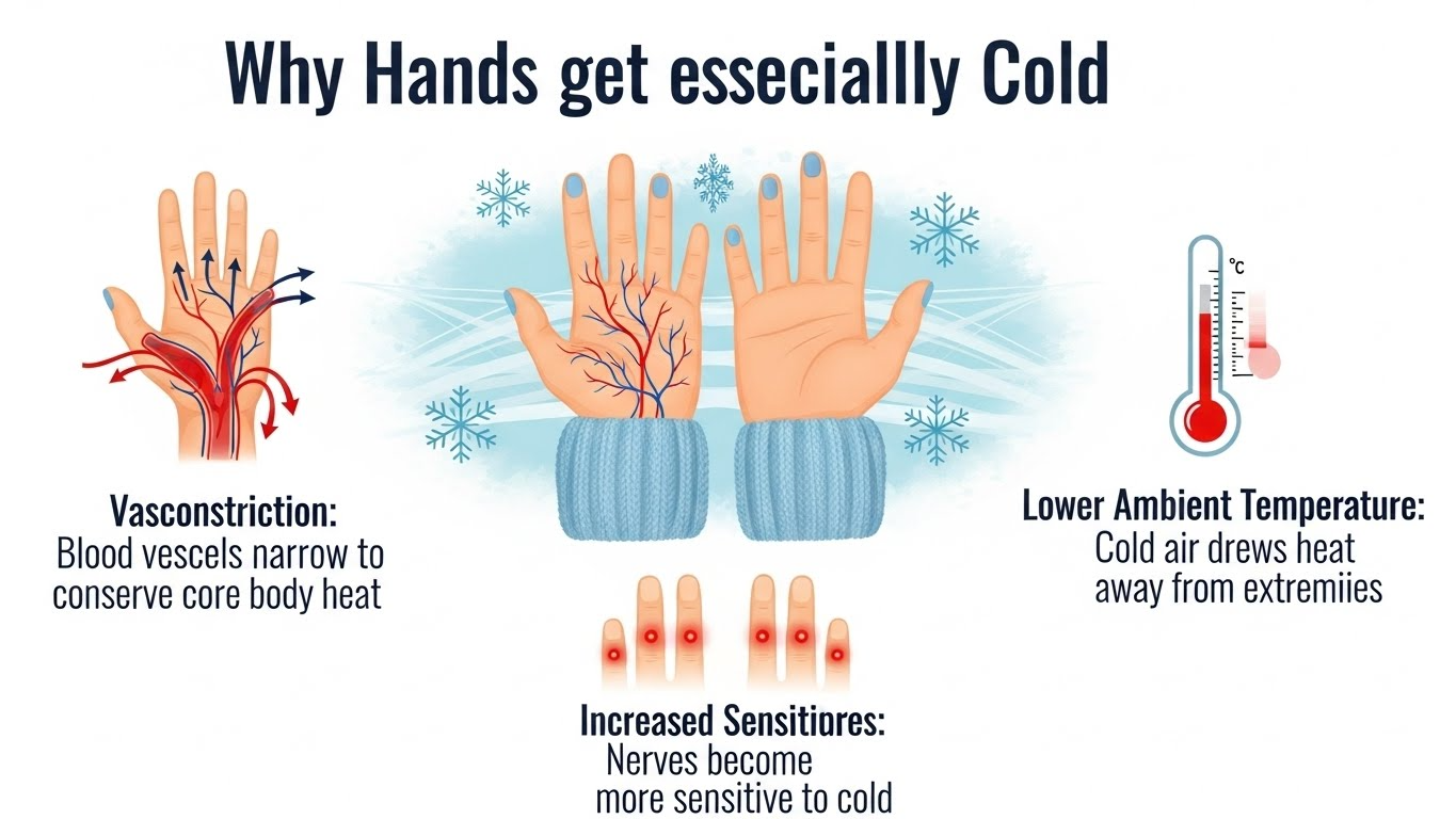 ● 겨울철 손이 차가워지는 주된 원인은 혈관 수축과 말초순환 장애입니다. 체온 유지를 위해 우리 몸은 중요한 장기에 혈액을 우선 공급하고, 손발과 같은 말초부위는 혈류량을 줄이게 되어 차가움을 느끼게 됩니다.