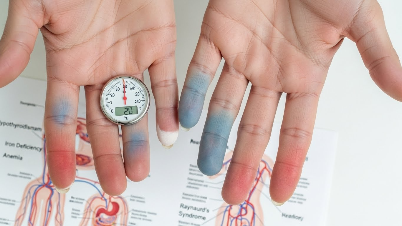 철분결핍성 빈혈은 산소 운반 능력이 떨어지면서 손발이 차가워지고, 창백한 피부색, 쉽게 피곤함, 두통, 어지럼증이 동반돼요. 레이노 증후군은 추위나 스트레스에 노출되면 손가락 혈관이 과도하게 수축하면서 손가락 색깔이 하얗게 변했다가 파랗게, 그리고 빨갛게 변하는 3단계 색 변화가 특징이에요.
