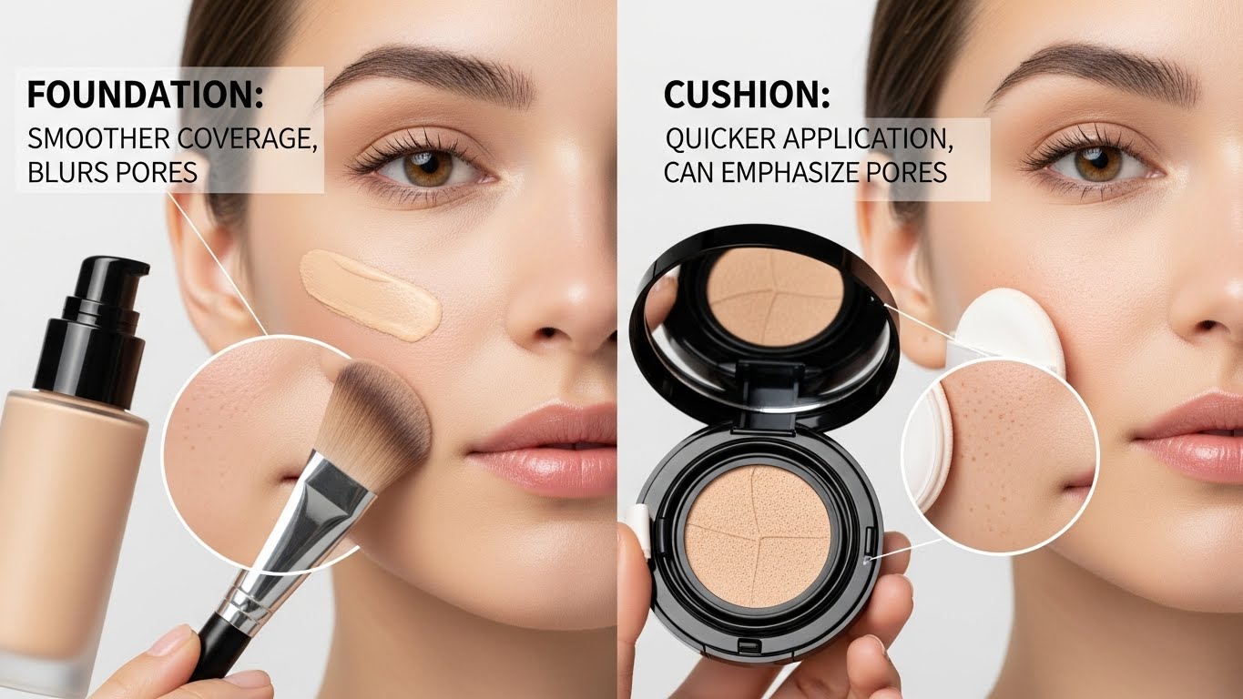 A. 제품 타입보다는 입자 크기와 질감이 더 중요합니다. 쿠션도 커버력이 높으면 모공에 쌓일 수 있어요.