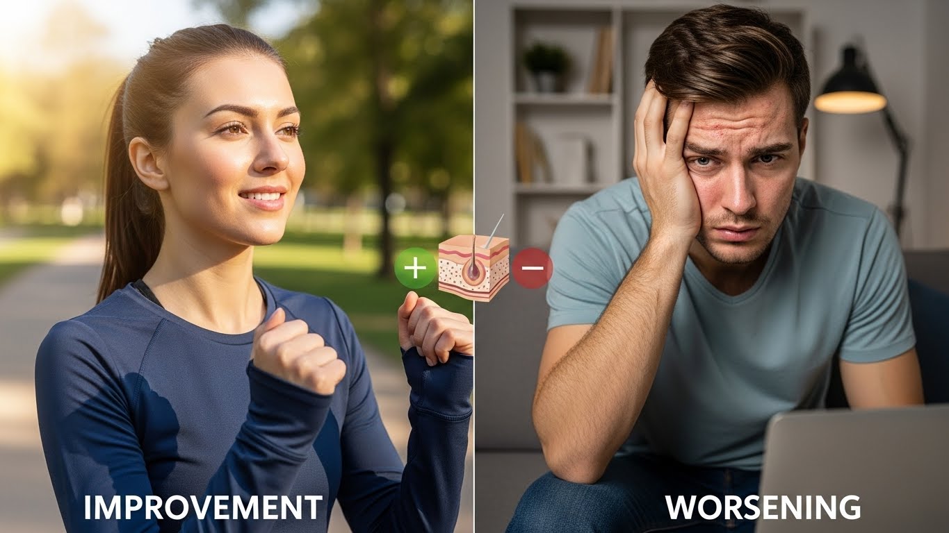 두 번째는 스트레스 완화 효과예요. 적당한 운동은 세로토닌 같은 신경전달물질 분비를 촉진해서 심리적 안정감을 줄 수 있어요. 스트레스가 줄면 피부 염증 반응도 완화될 가능성이 있고요.